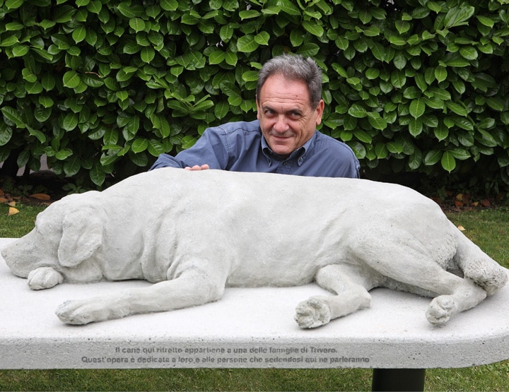 Ciò gli ha consentito di entrare in contatto con i ragazzi, i loro famigliari e i possessori degli animali, incontrandoli, fotografandoli e coinvolgendoli nella realizzazione del progetto. Il risultato è un’opera pubblica che può essere utilizzata (e “adottata”) da tutti: una serie di panchine in cemento sulle quali siedono uno o più ritratti dal vero dei cani, con incisa la seguente didascalia: Il cane qui ritratto appartiene a una delle famiglie di Trivero. Quest’opera è dedicata a loro e alle persone che sedendosi qui ne parleranno.
